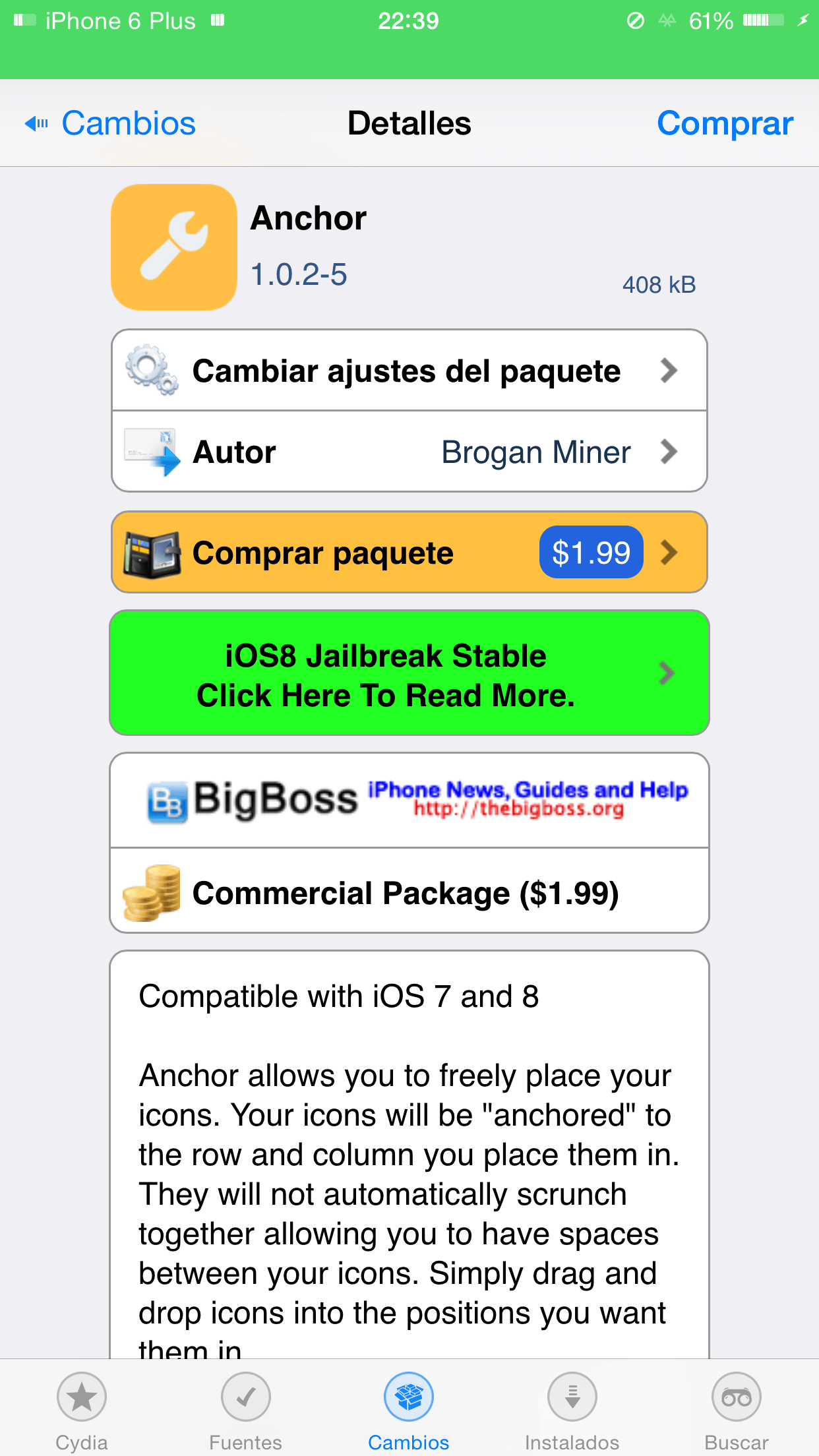 Anchor tiene un costo de $1.99 dólares en el repositorio de BigBoss de Cydia, no se sabe exactamente con que dispositivos es compatible ya que en la información del tweak no lo dice pero puede que funcione con todos, con el iPad, iPod y por supuesto el iPhone. Ademas es compatible también con iOS 7 y iOS 8.