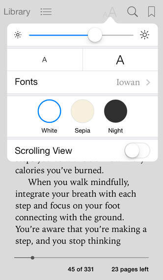- Elija entre siete hermosas fuentes y tres colores de página para una fácil lectura.