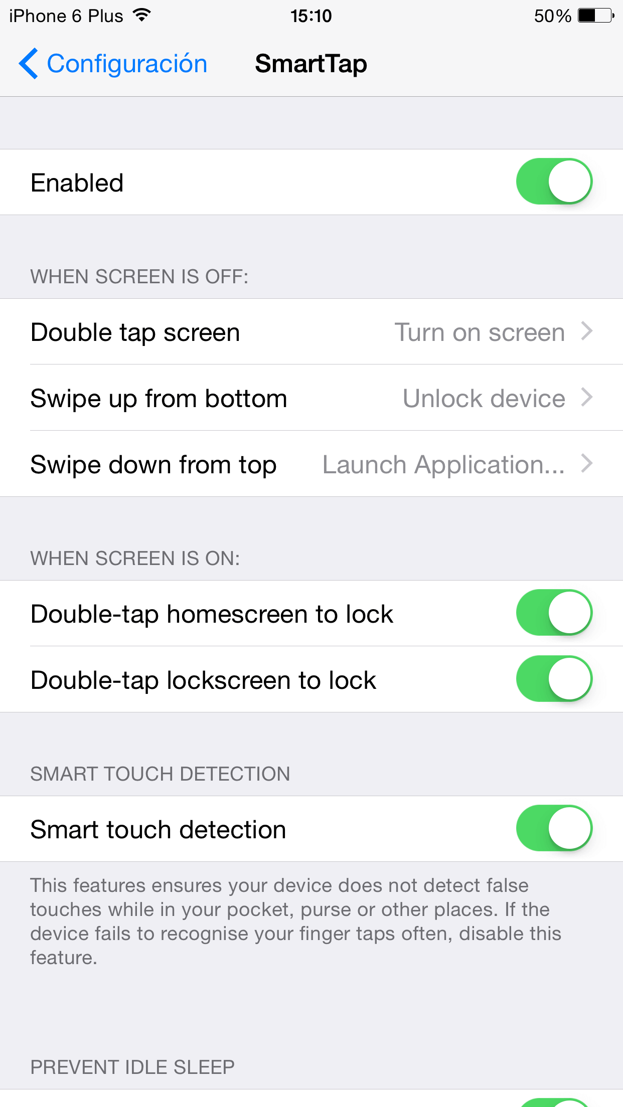 Cuando el tweak este instalado en nuestro dispositivo nos va a dejar un menu de ajustes dentro de la aplicaciones de ajustes en donde vamos a poder habilitar el tweak o también deshabilitarlo. Podremos seleccionar las acciones del doble tap o cuando deslizamos hacia arriba o hacia abajo cuando la pantalla esta apagado, ósea, cuando este bloqueado nuestro dispositivo.