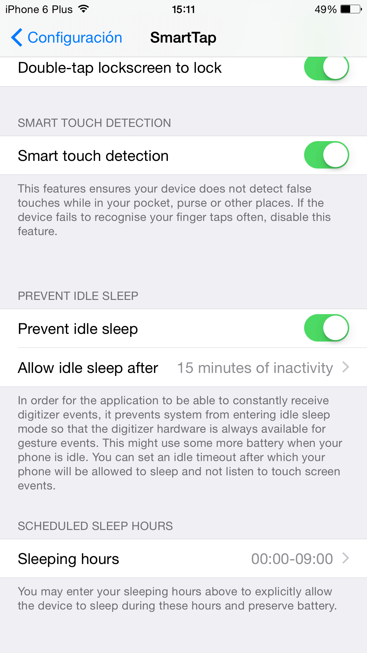 La opción de Smart Touch Detection sirve para que el dispositivo no reconozca toque falsos en la pantalla y así no haga cosas que nosotros no queramos, es recomendable tenerlo activado. También podremos poner cada que tiempo queremos que este activo este tweak ya que obviamente puede gastarnos mucha batería si lo tenemos siempre activo. Por ultimo podemos configurar las horas en las que nosotros dormimos para que el tweak deje de funcionar automáticamente durante ese tiempo.