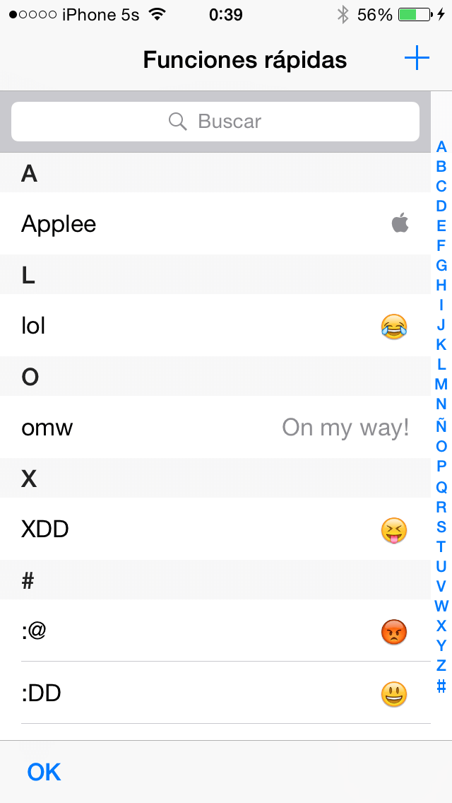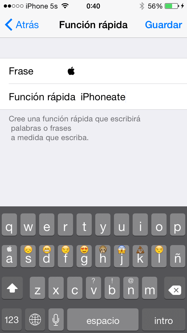 Una vez hecho eso le damos en Guardar y ahora cada vez que escribamos la palabra que hemos puesto en Función rápida, nos dará la opción de poner en este caso la manzana de Apple o si apretamos la tecla espacio se pondrá automáticamente.