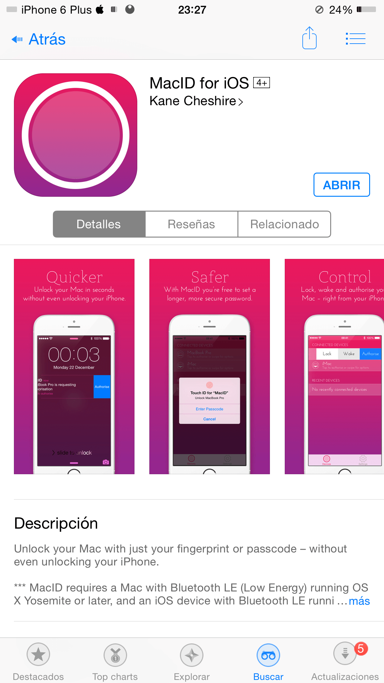 Con la llegada de OS X Yosemite y iOS 8, estos sistemas operativos son muy unidos y gracias a la tecnología de conectividad Bluetooth LE gastaremos muy poco en batería y esta aplicación nos permite desbloquear nuestra Mac con el TouchID o si no tenemos un dispositivo con TouchID podemos usar un teclado y en nuestra Mac podemos dar Tap’s en el Trackpad de nuestra Mac.