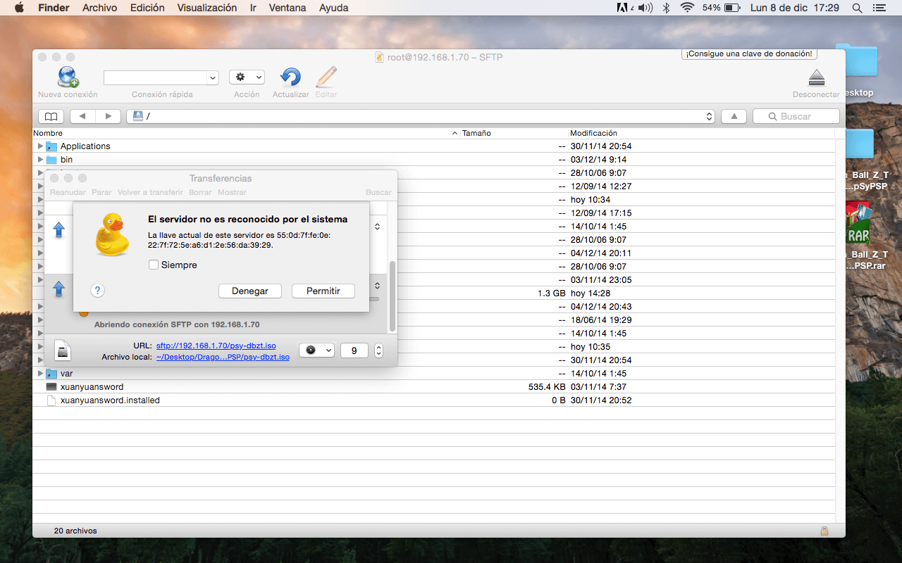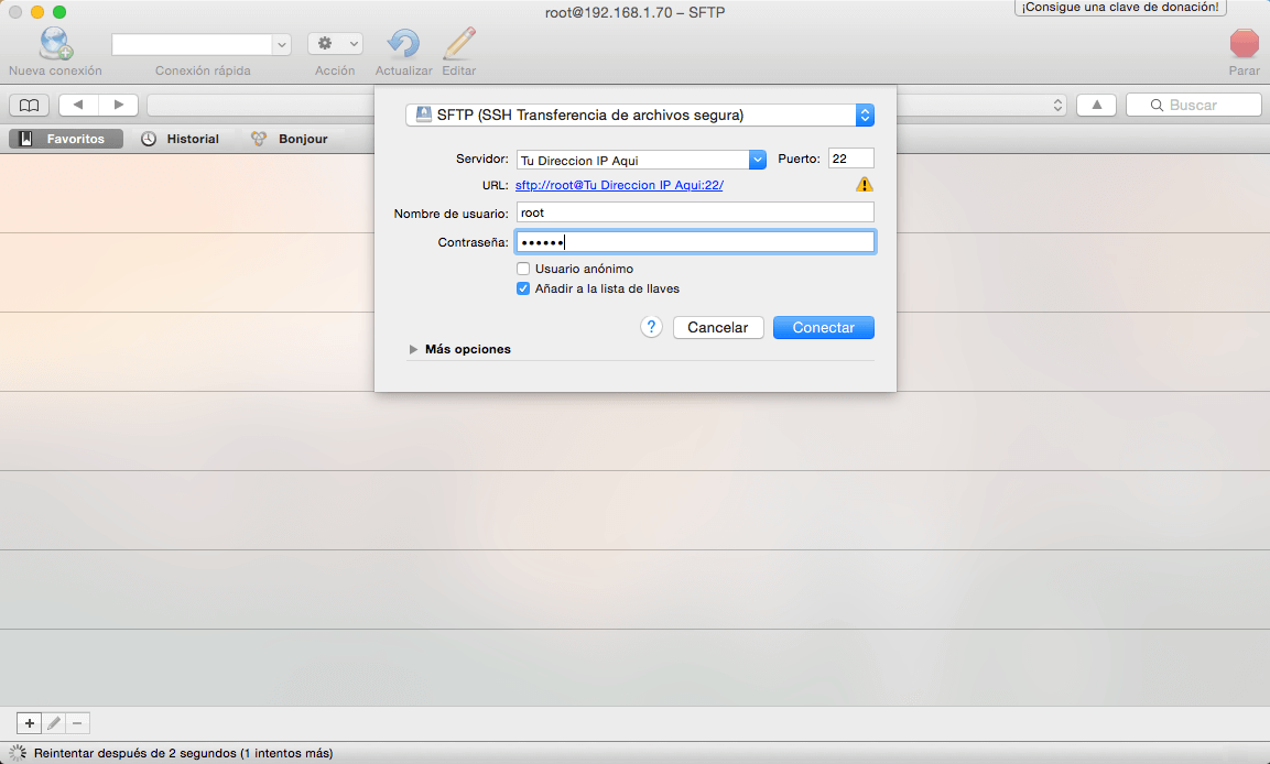 Teniendo el archivo .ISO tendremos que usar Cyberduck si estas en Mac o WinSCP si estas en Windows, el procedimiento será el mismo y es muy importante que elijan el tipo de transferencia como SFTP. Lo único que deben hacer en su dispositivo es entrar a Ajustes – Wi-Fi – Pulsar en el botón del signo de admiración que aparece del lado derecho de la conexión al cual estamos conectados y encontraremos la dirección IP el cual van a poner en la parte de Servidor de Cyberduck o WinSCP.