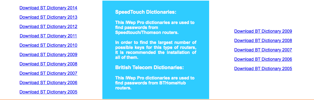 Una vez que compremos la aplicación ya tendremos acceso a todas sus próximas actualizaciones aunque esta aplicación no es nada si no instalamos los famosos diccionarios. Los diccionarios son las vitaminas de esta App ya que sin ellos no podrás obtener ninguna contraseña, los podemos descargar de manera gratuita desde la pagina oficial del desarrollador de iWep Pro, pueden entrar a esa pagina dando click aquí. Existen dos tipos de diccionarios, los ST y los BT. Los ST son para los que vivimos en America y los BT son para los que viven en Europa. En el repositorio de iPhoneate podrás encontrar un paquete que contiene los Diccionarios del 2005 al 2011 en el caso de los ST y en el caso del paquete de los BT son del 2005 al 2008. Los nuevos diccionarios ST del 2012 al 2014 los deberas descargar de la pagina oficial al igual el 2009 de los BT.