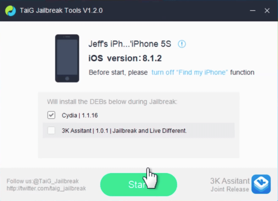 7.-Cuando TaiG detecte nuestro dispositivo debemos desactivar la casilla donde marca la aplicación de 3K Assitant y asegurarnos de que la casilla de Cydia este activada (vea la imagen de abajo).