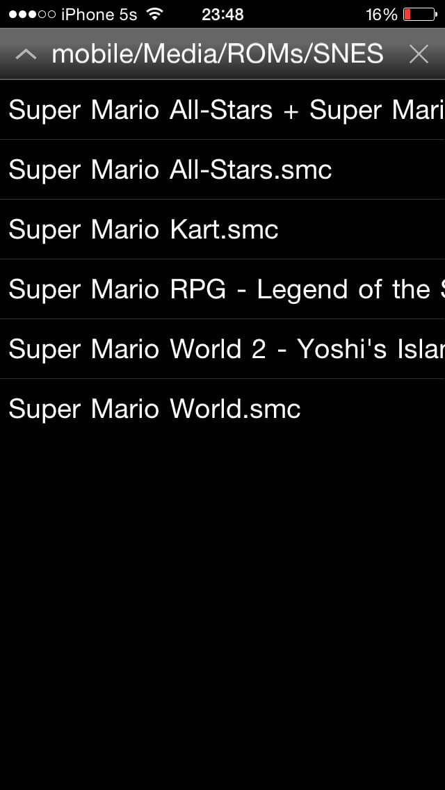 Al momento de que abran la aplicación puede que les aparezcan los juegos como en la imagen de abajo o puede que no, pero no se alarmen que solo se necesitan seguir estos pasos: 1.-var 2.-mobile 3.-media 4.-roms 5.-snes. Siguiendo estos pasos encontraras los juegos descargados, de todos modos pueden ver el tutorial para que no tengan problemas.
