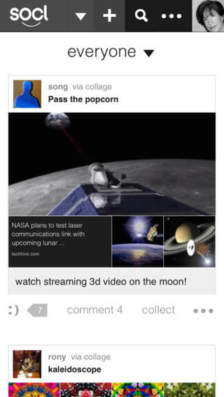 Socl, le permite crear, recopilar y compartir las cosas más creativas que usted pueda crear, a través de divertidos collages visuales, medios animados y memes, que le permitirán expresarse con imágenes y mensajes. También podrá compartirlo con Facebook, Pinterest, Tumblr y Twitter.