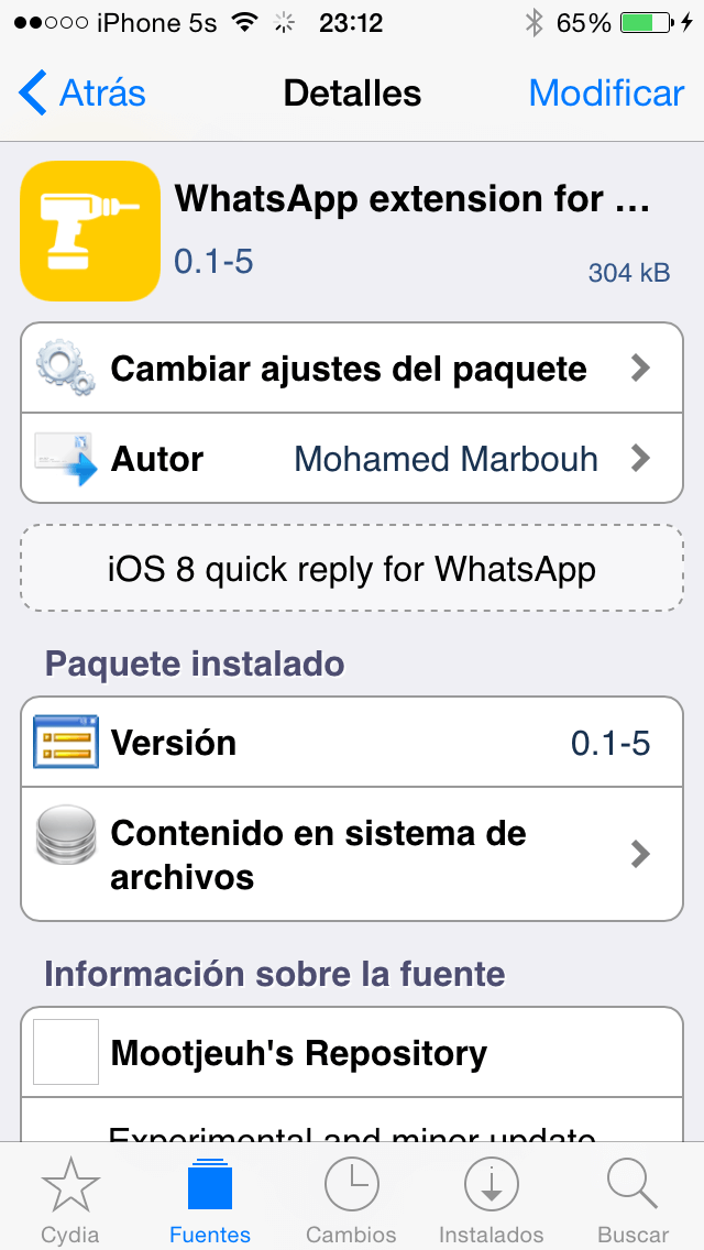Si descargaste el tweak de otro repositorio tendrás que conseguir la extensión de WhatsApp también de otro repositorio.