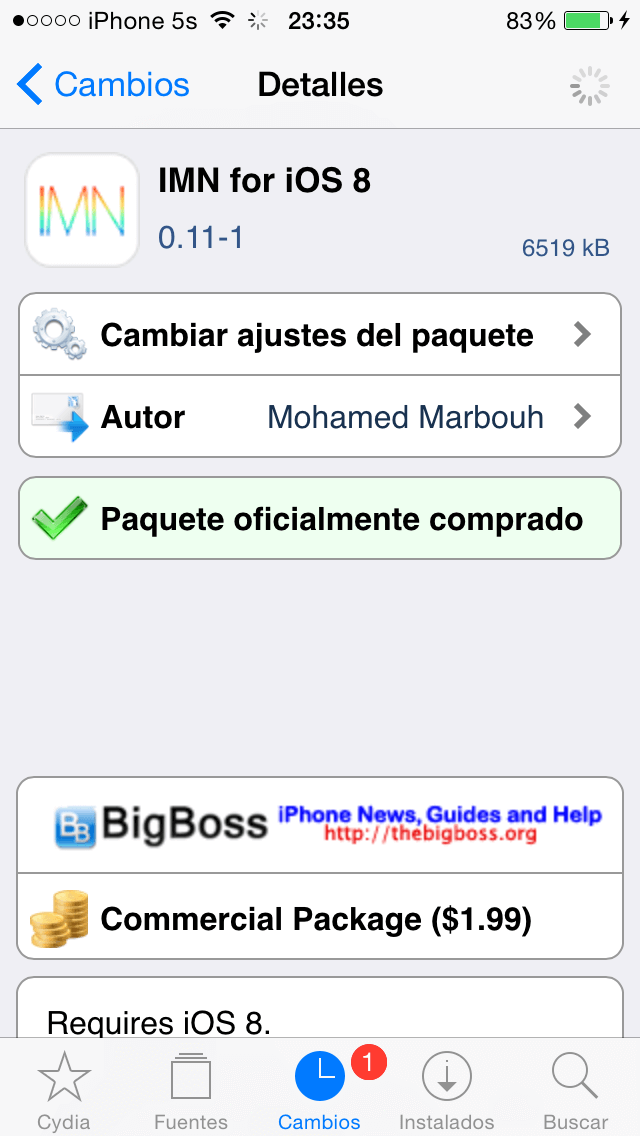 El tweak tiene un costo de $1.99 dólares en el repositorio de BigBoss y si quieren un correcto funcionamiento es mejor que lo compren. Algo muy importante es que si quieren tener las notificaciones interactivas de WhatsApp deben instalar la extensión que el mismo developer hizo y que esta disponible en su repositorio aunque esta versión solo funcionaria si compraste el tweak: http://repo.mootjeuh.com/