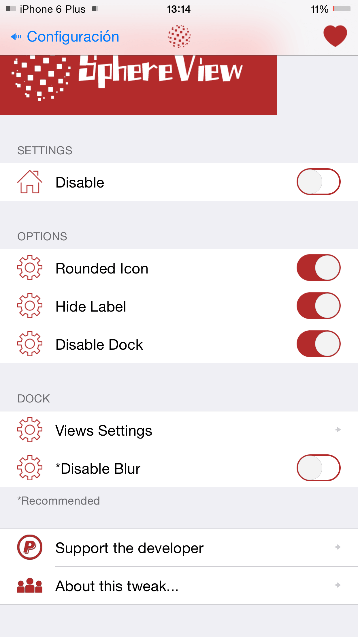Una vez instalado notaremos lo notorios cambios en nuestro iDevice y nos dejara un menu de ajustes para configurar el aspecto de la esfera y de nuestro Dock. Podremos activarlo o desactivarlo, poder activar o desactivar funciones para tener los iconos redondos, quitar el nombre de las apps o quitar el Dock.