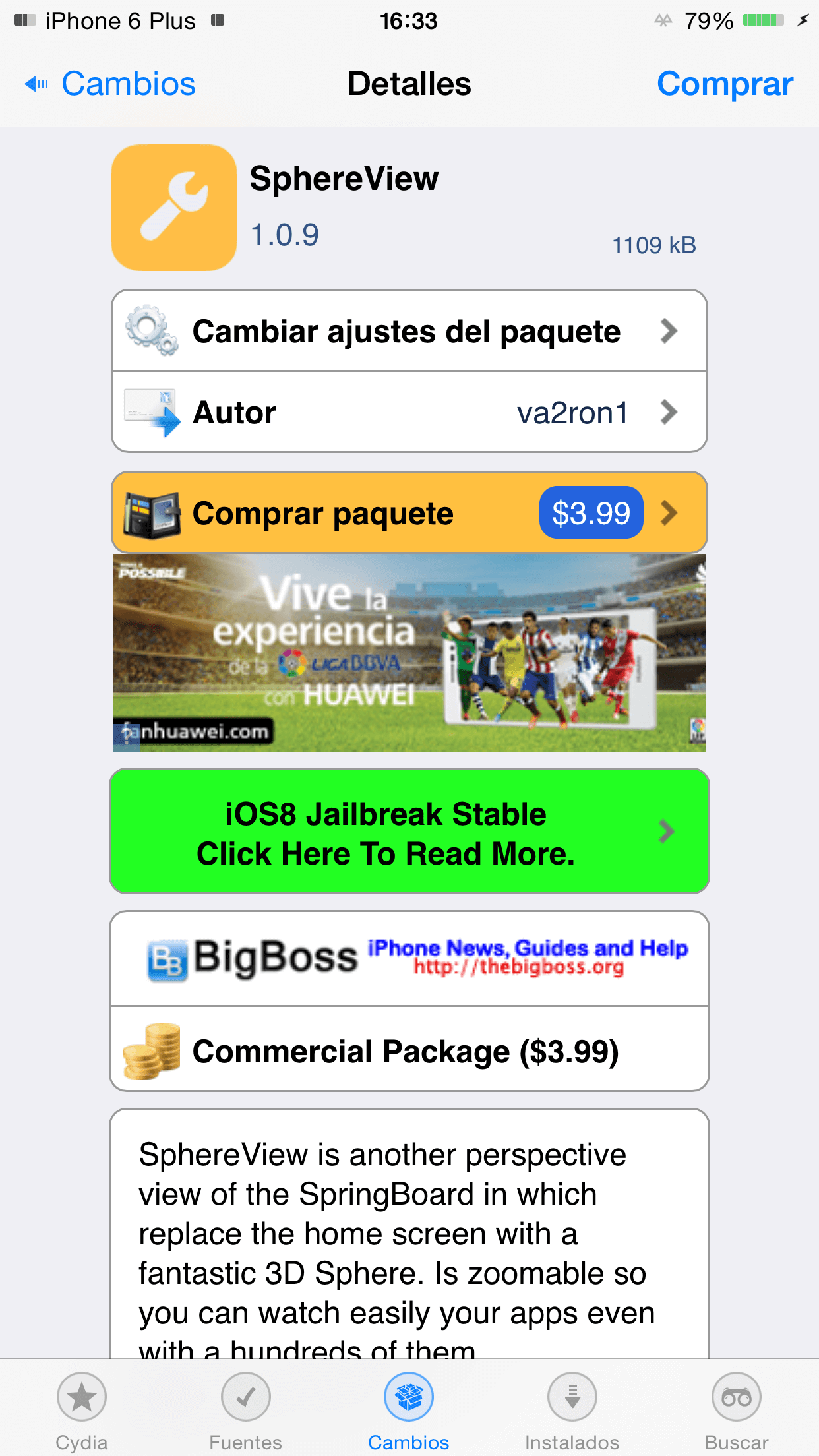 SphereView tiene el costo de $3.99 dólares en el repositorio de BigBoss, un poco cara para lo poco productiva que es, sin embargo la animación es increíble. Es solo compatible con iOS 8 pero es compatible con todos los dispositivos, el iPhone, el iPad y el iPod.
