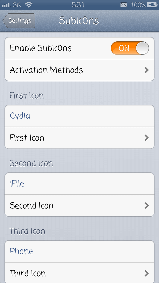 Sublc0ns es un tweak nuevo disponible en cydia completamente gratis. Este tweak nos permite abrir 6 aplicaciones favoritas de forma sencilla y rápida, gracias a un método de activación elegido usando Activator. Les dejo un video para que vean como funciona.