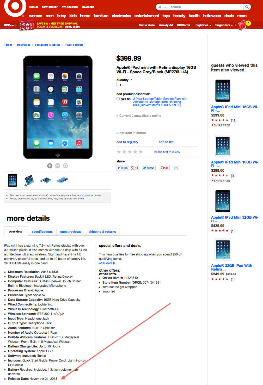 De acuerdo con una lista de productos disponibles de Target, el nuevo iPad Mini Pantalla Retina podría estar a la venta este 21 de noviembre.