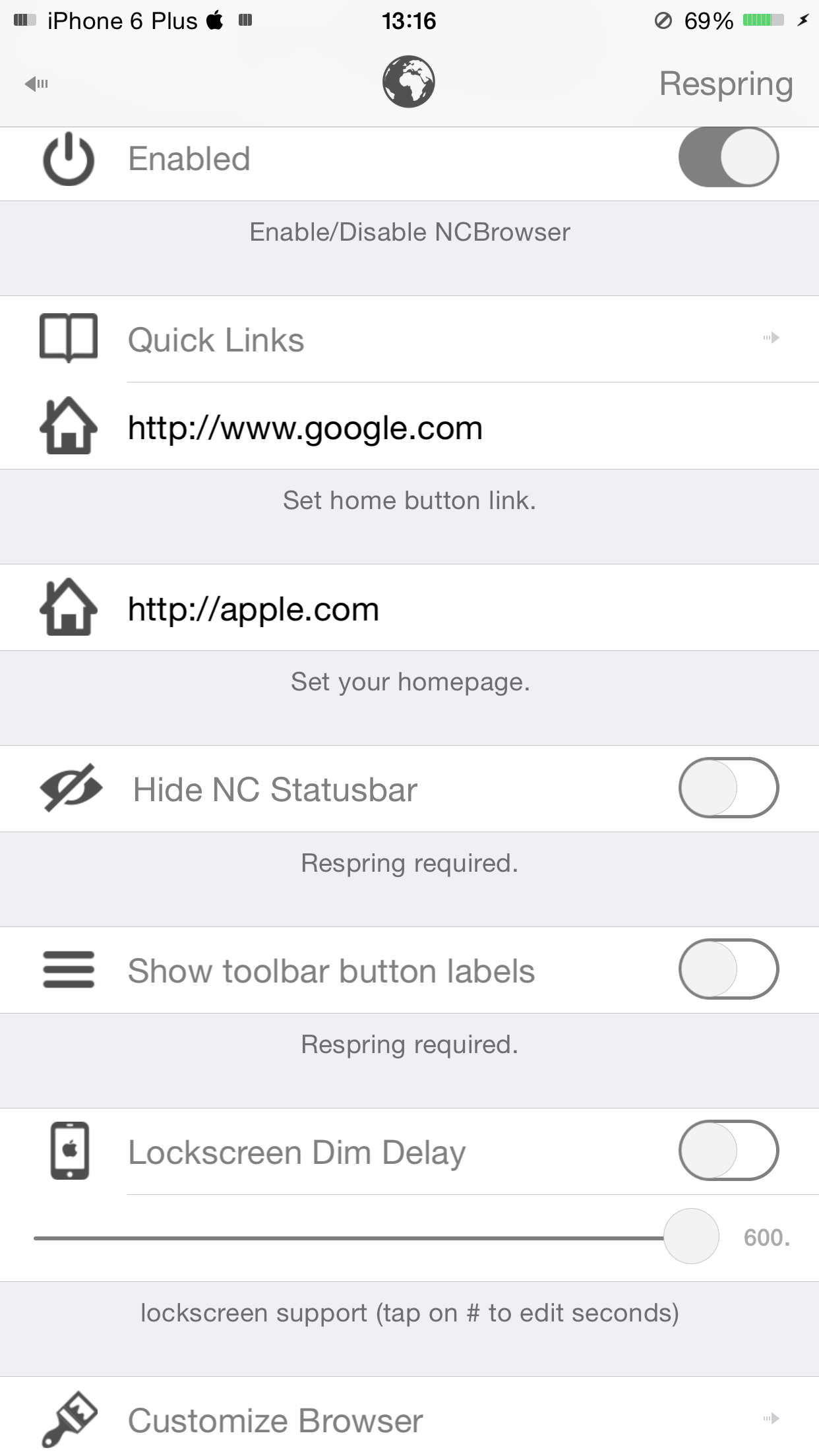 Una vez descargado e instalado tendremos un menu de ajustes dentro de la aplicación de ajustes donde lo podemos configurar nuestro navegador totalmente. Podemos activarlo o desactivarlo, configurar nuestros Quick Links que podemos usarlos dando doble Tap en el botón de Home que tenemos en el navegador.