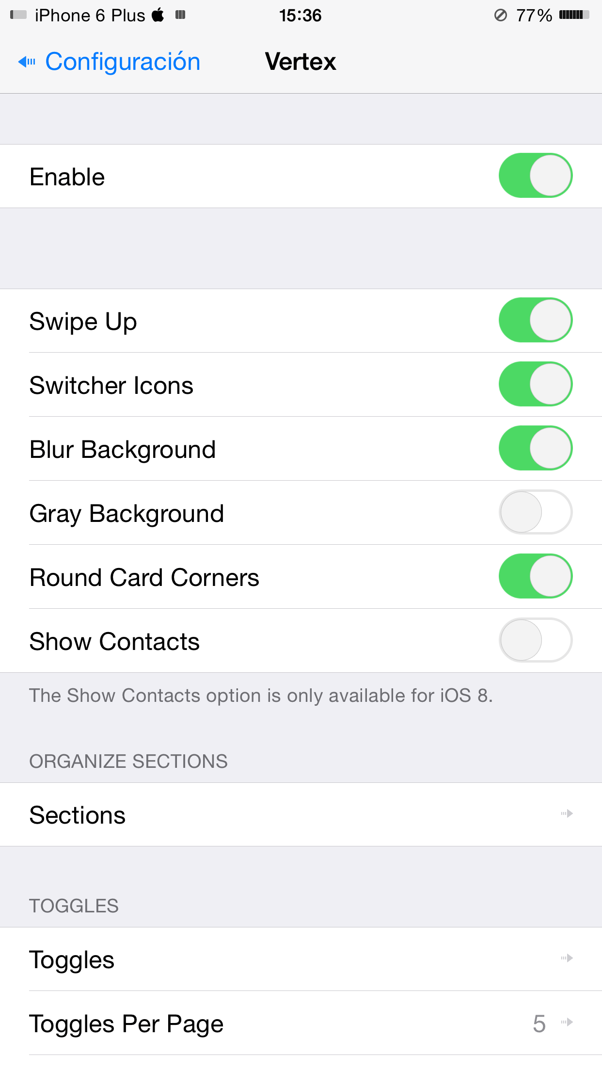 Nos dejara un menu dentro del menu de ajustes donde podremos configurar el Tweak par activarlo o desactivarlo. Podemos activar mas opciones como el Swipe para activarlo, un blur de fondo, fondo en color gris, esquinas redondeadas en los preview de las aplicaciones del multitarea o también si están en iOS 8 mostrar los contactos recientes y favoritos si es que tenemos activada esa función de iOS 8.