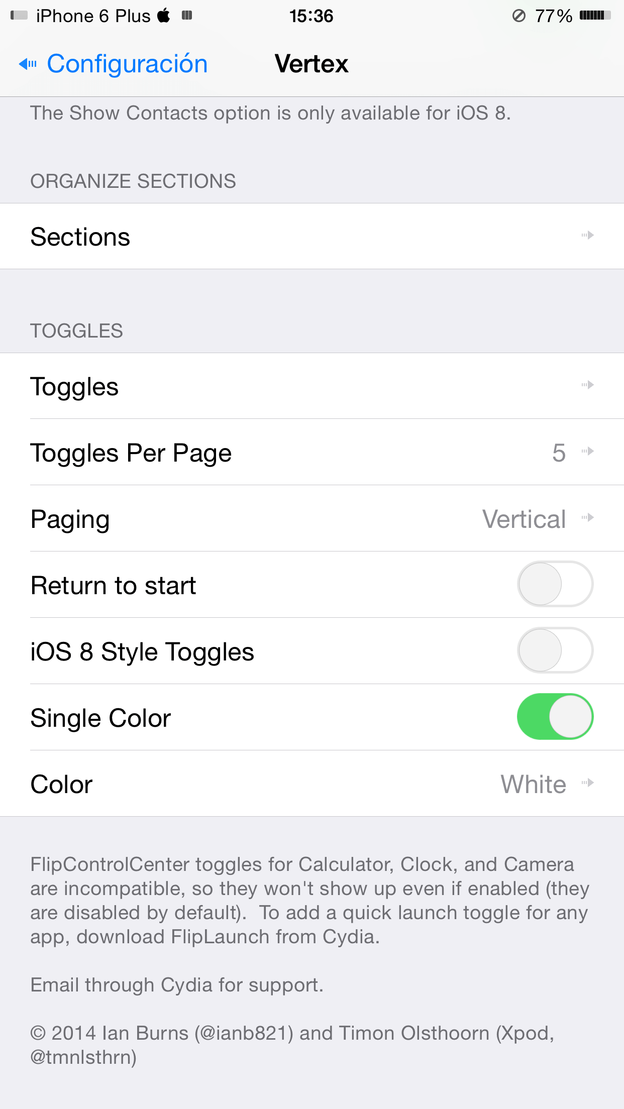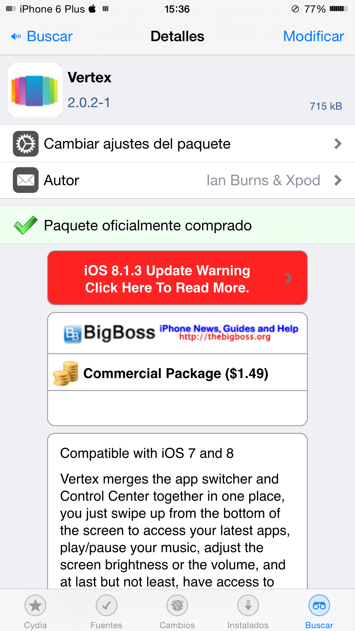Vertex tiene un costo de $1.49 dólares en el repositorio de BigBoss de Cydia, es compatible con el iPhone y el iPod en iOS 7 y iOS 8.