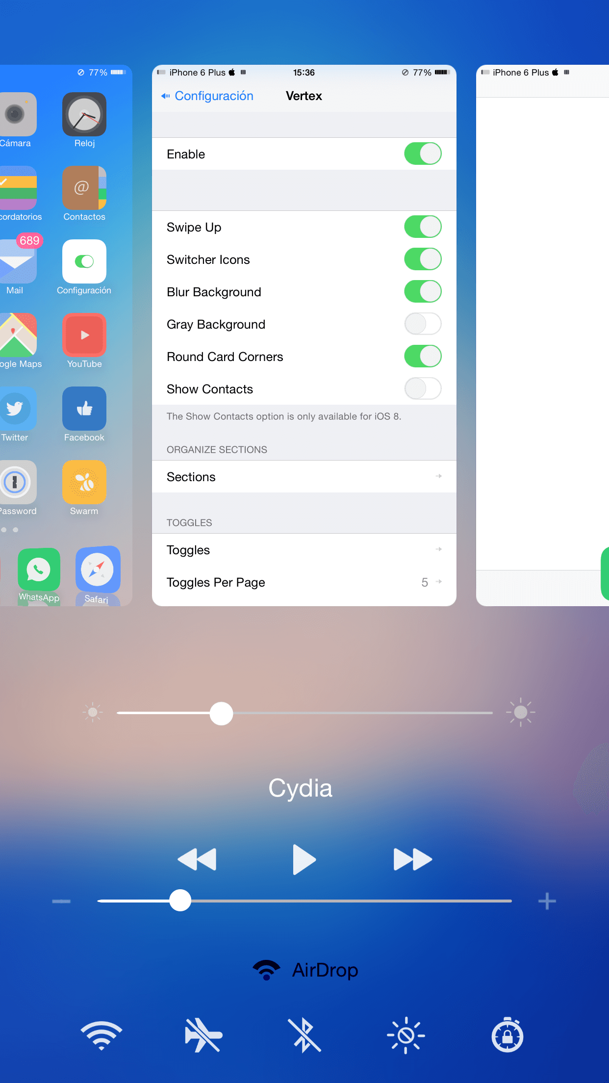 Una vez instalado notaremos los cambios si activamos deslizando desde la parte de abajo como si quisiéramos activar el Control Center o también pulsando dos veces nuestro botón de Home, veremos que tenemos Vertex funcionando, teniendo el multitarea y el Control Center juntos.