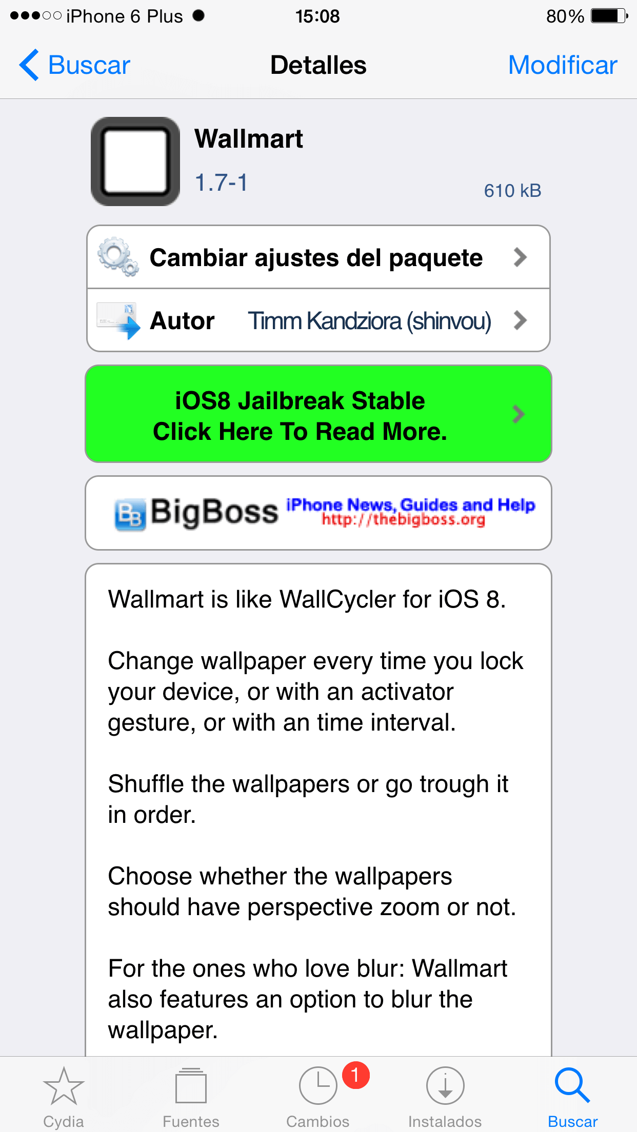 Wallmart es totalemente gratis en el repositorio de BigBoss de Cydia, es compatible solo con iOS 8 pero es compatible con todos los dispositivos, el iPad, el iPod y el iPhone.