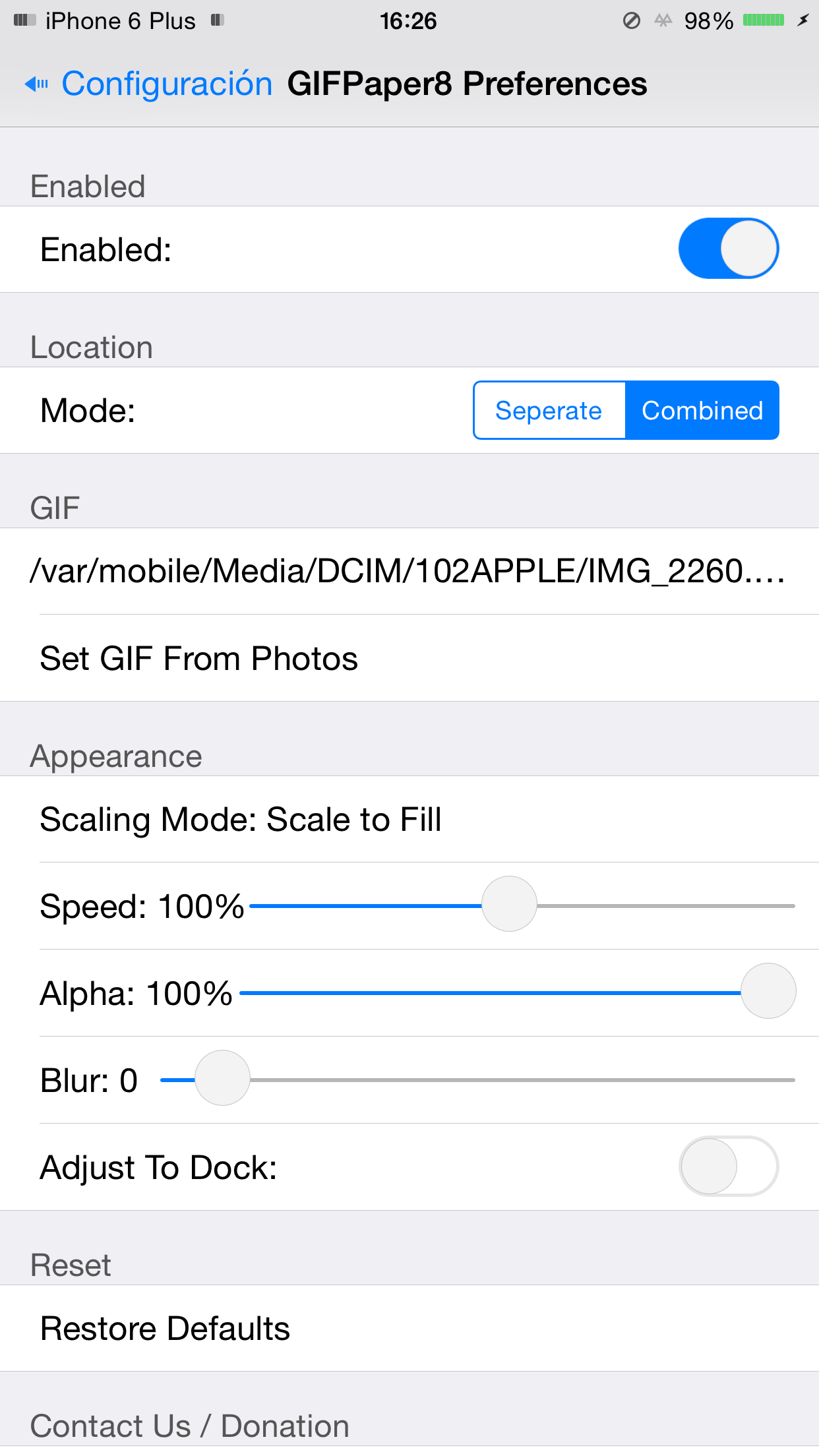 También podremos cambiar la escala de la imagen, la velocidad, el alpha y el blur de la imagen GIF o hasta ajustar la imagen con el Dock. También tenemos un botón para restaurar los ajustes por si modificamos de mas.