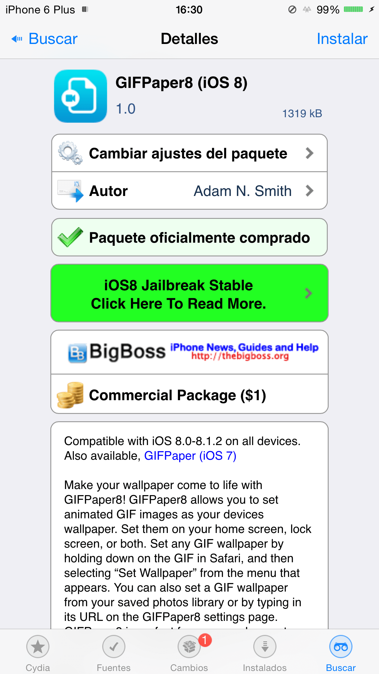 GIFPaper tiene un costo de solo $1 dolar en el repositorio de BigBoss de Cydia, es compatible con iOS 7 y iOS 8 pero cada iOS tiene su propia version del tweak. También es compatible con todos los dispositivos, el iPad, el iPod y el iPhone.